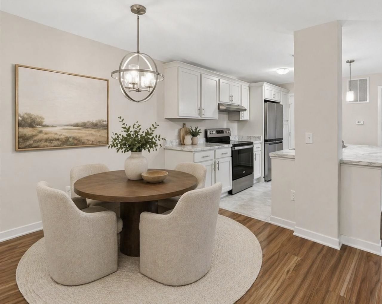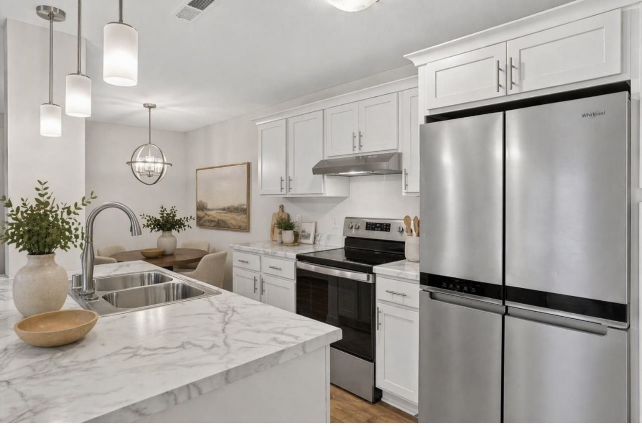 Completely updated and renovated from the studs in, this upper unit offers stylish, modern living throughout. Everything inside is brand new, with the exception of the 2 year new stainless steel appliances, which are in great condition. The kitchen features white shaker cabinets and a convenient breakfast bar open to the main living space. Warm wood-tone LVP flooring, crisp white trim, and neutral paint create a clean, inviting feel. Offering 3 spacious bedrooms with oversized walk-in closets, 2 full baths, and a dedicated in-unit laundry room. Additional updates include a new furnace, water heater (Oct 2025), roof, siding, HVAC, and exterior steps. Detached 1-car garage plus 2 additional parking spaces. Trendy finishes, functional layout, and move-in ready! (All furniture is virtually staged)