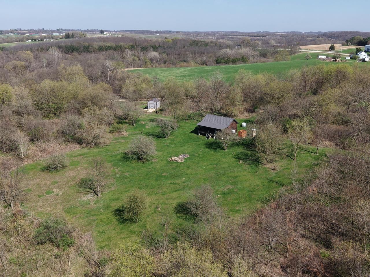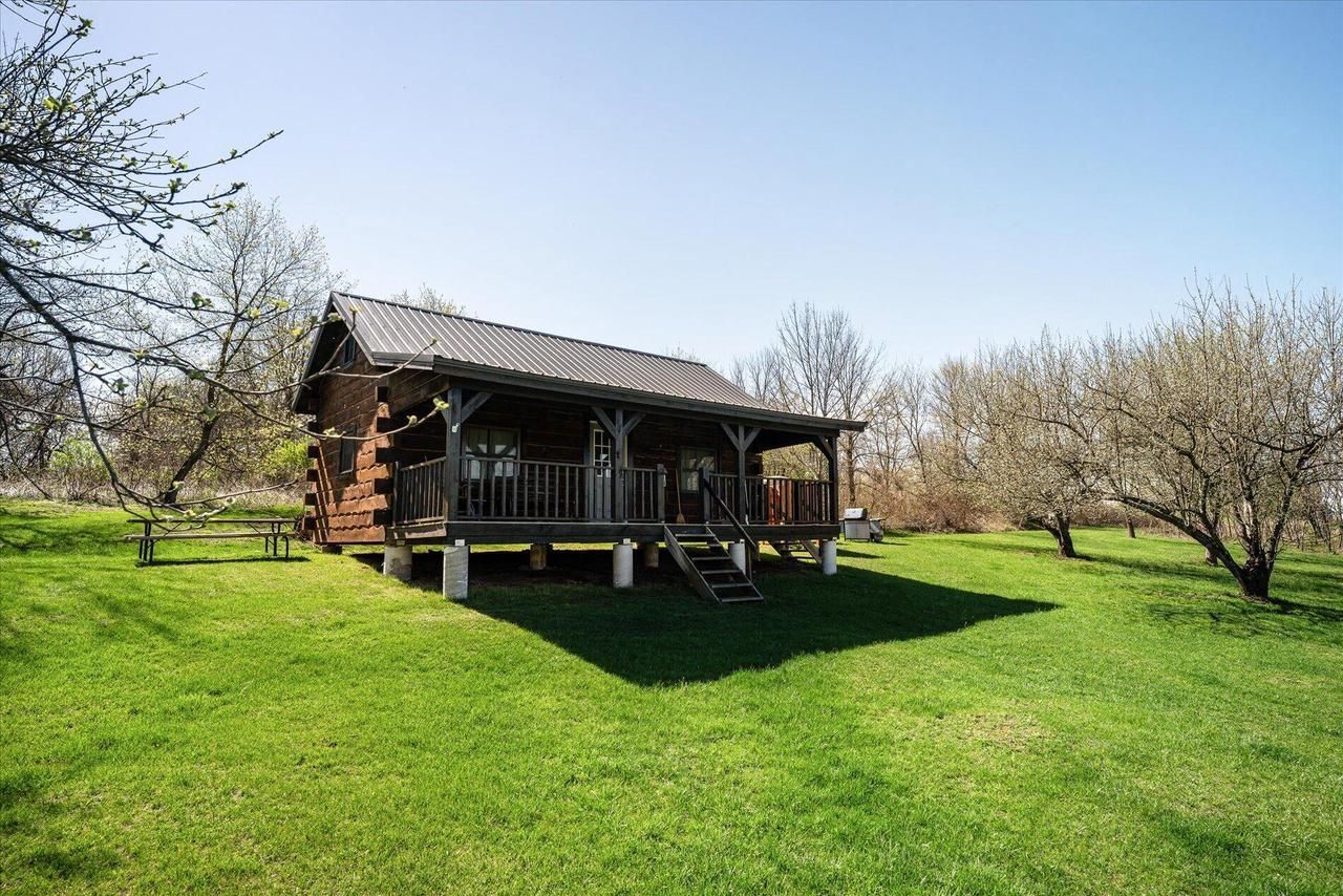 Set in the heart of apple country in Southwest Wisconsin's scenic Driftless Region, this 10-acre mostly wooded retreat offers a peaceful ridgetop setting w/ refreshing breezes & sweeping long-distance views. The charming log cabin features a spacious open-concept main floor & two cozy sleeping lofts, creating a warm & inviting getaway. A newer mini-split heat pump (just 2 years old) provides efficient heating & cooling, while a ready-to-use chimney invites future gas fireplace ambiance. Enjoy the outdoors w/ walking trails, the many apple trees, abundant wildlife, an outdoor shower area, & a handy garden shed. Unwind on the covered deck with stunning sunset views. Located near Mississippi River recreation & trout streams. Furnishings included if desired. No well or septic.