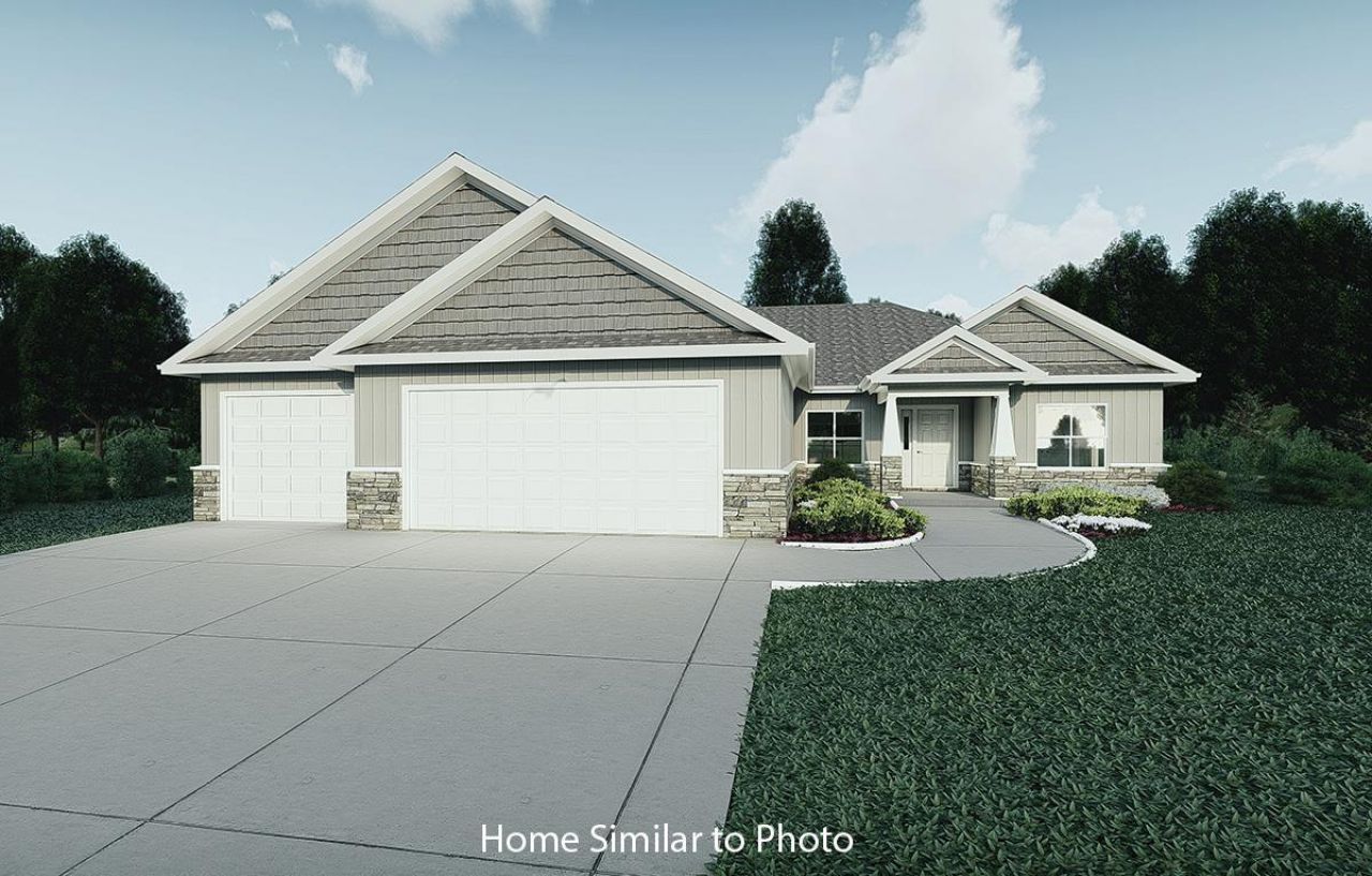 Beautiful new 1916sf ranch in Hazel Estates S/D. Great curb appeal w/horizontal vinyl siding, shakes in roof peaks, & brick per plan. Home offers an open concept/split bdrm design w/3 bdrms & 2.5 baths. Inviting foyer welcomes you into a nice size living room w/gas FP. Nice kitchen w/oversized island incl sink, custom maple cabinets, walk-in pantry & SS dishwasher & microwave. Private master w/lrg walk-in closet w/laundry room access & private bath w/dbl sinks & walk-in shower. Other features incl a front pocket office & convenient 1st-floor lndry w/access to half bath. Att 3-stall garage w/bsmnt access. Bsmnt is plumbed for a future bath & has an egress window. Main photo is computer generated. Photos are similar but may not be exact. Virtual staging in photos.